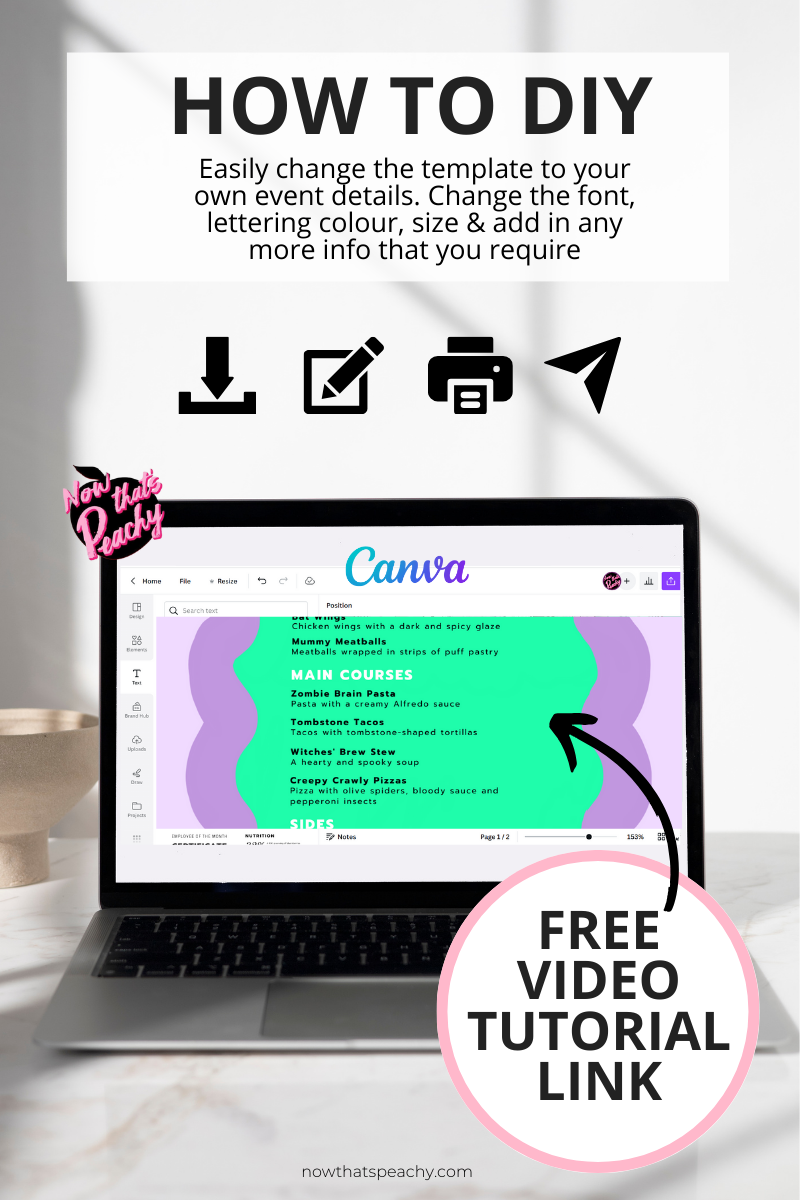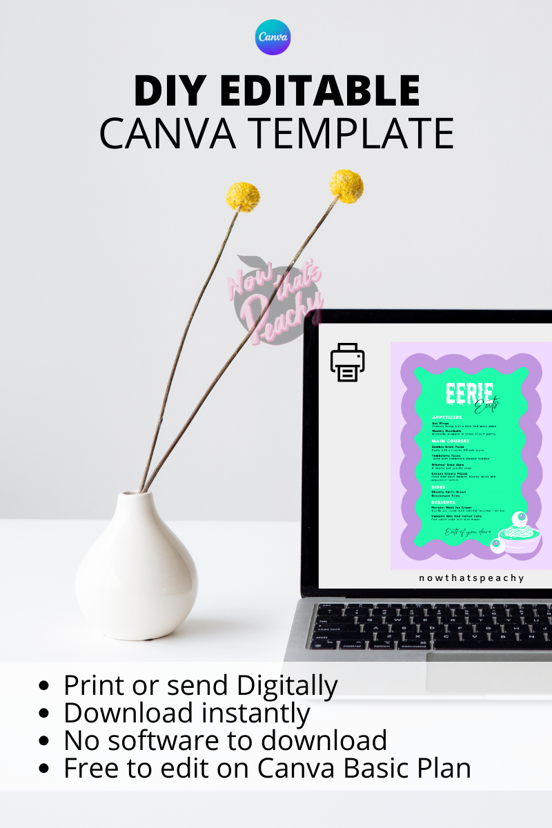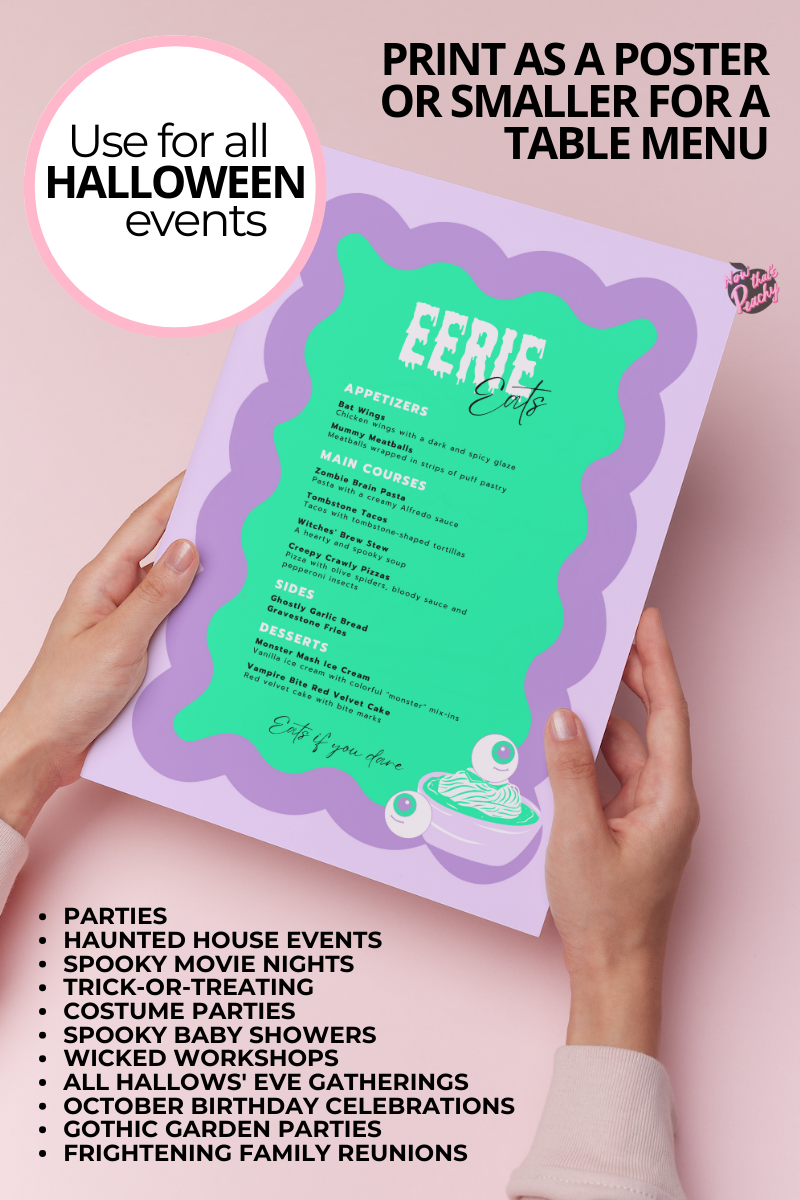 Customisable: Tailor the menu to fit your unique event by adding your own text, and changing fonts and font colours. EERIE EATS Heading is fully editable
